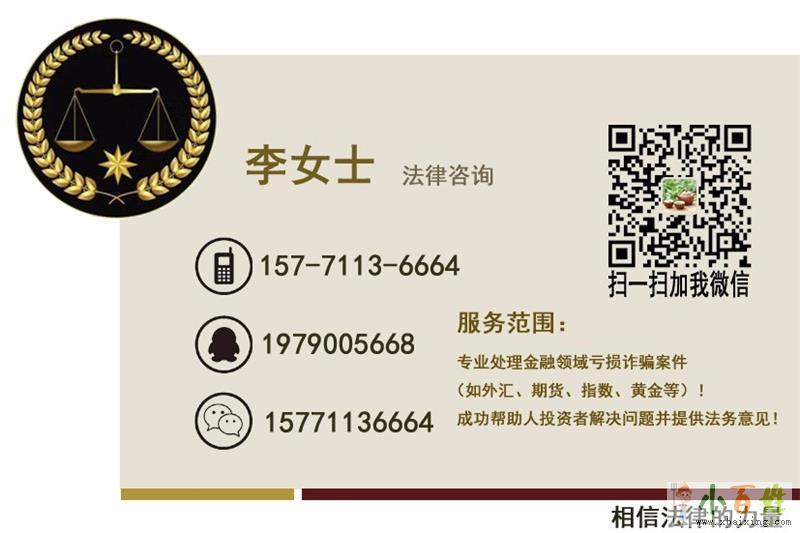 我们是法律咨询团队经验丰富,有多种渠道进行技术亏损挽回,四加一模式成功率高,已经有成功案例,尽快处理,时效性会更高,成功机率就越大!外汇、指数诈骗案子层出不穷,违法途径暗箱操作。依据我国法令法规,在不合规不合法途径操作被骗的资金,都是可经过正当的亏损挽回追回资金的,经验丰富的咨询团队,法律咨询亏损挽回能以最快的速度挽救亏损资金!不论你是在股票、现货、邮币卡、大宗产品、外汇等亏损或不让出金均可联系法律咨询李女士!