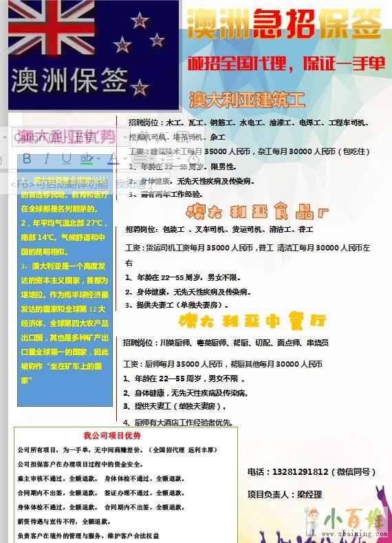 万鼎出国劳务保签不成功不收费澳洲/新西兰/英国/招建筑/普工/司机诚聘区域代理,报酬丰厚,手里人脉、资源广优先招聘国家:加拿大,澳大利亚,以色列,英国,新西兰,挪威,意大利,丹麦,美国,法国,奥地利,...